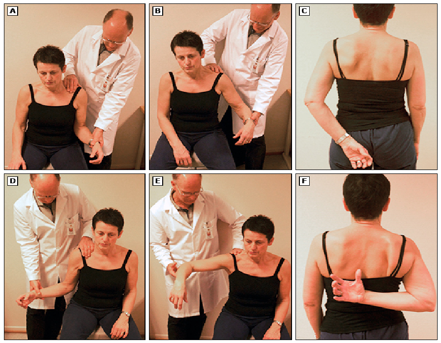 | Hạn chế vận động trong viêm quanh khớp vai. Các hình ảnh ở trên cho thấy các hạn chế vận động do viêm quanh khớp vai. Lưu ý rằng vai trái bị viêm bị hạn chế động tác quay ngoài (A), giạng ra (B), và quay trong (C) như thế nào khi được so sánh với vai phải không bị viêm (hình ảnh D, E, và F). Hình ảnh A, B, D, và E mô tả chuyển động thụ động của ổ khớp trong khi xương bả vai được giữ ổn định (Ảnh: uptodate.com) |